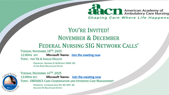 These sessions are a great opportunity to connect, share best practices, and strengthen collaboration across our ALL-Federal Nursing Communities. Please help us by sharing the attached invitation with your teams, community and encouraging participation. Together, we continue advancing ambulatory care nursing and fostering a culture of collaboration across ALL Federal agencies.