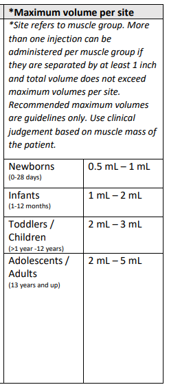 - Deltoid sites recommended for patients older than 3 years old – maximum injection volume of 1-2ml per site, with multiple injections separated by at least 2.5 cm (1 inch).