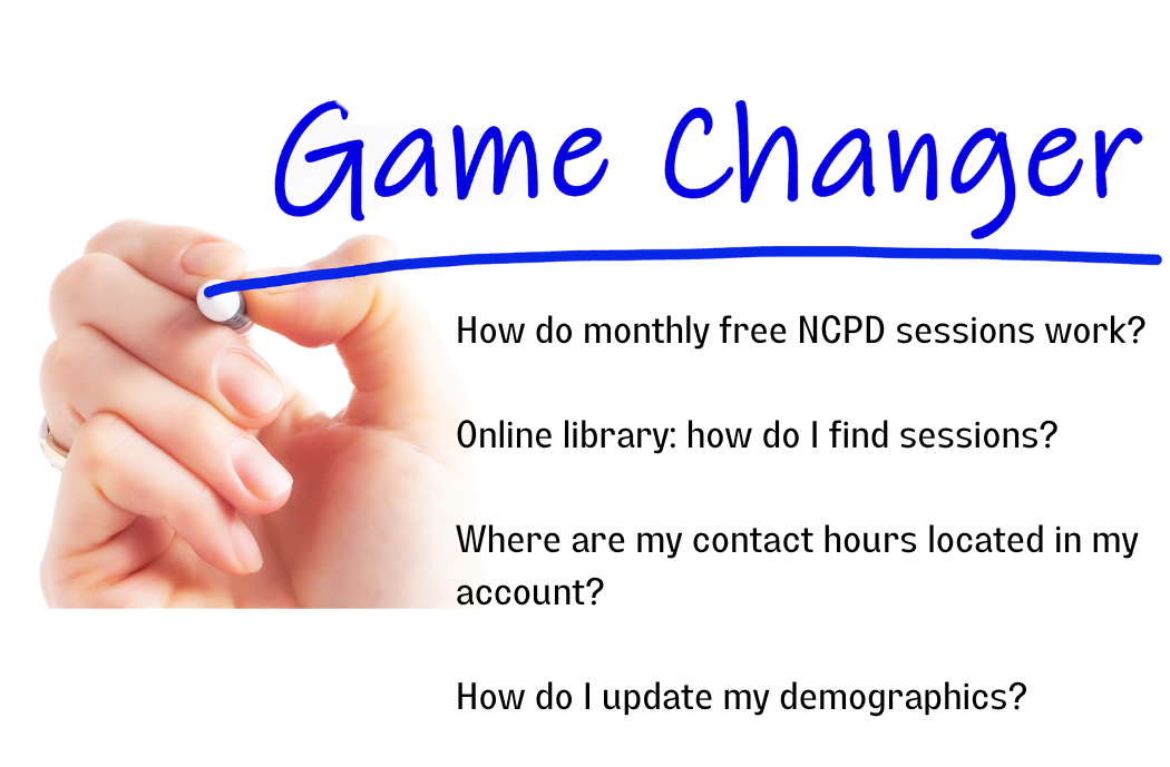 Reminder we'll hold our Quarterly Membership Game Changer call Tuesday evening at 7:00pm. Each quarter we'll focus on a different topic that will help you get the most from your membership. Tomorrow's call will highlight on the online library: where to find sessions, your contact hour certs; how to take advantage of the free NCPD contact hour sessions and how to update your demographics.